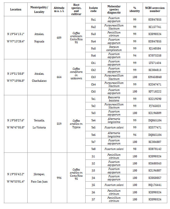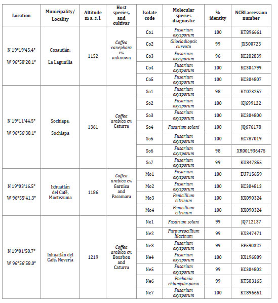 Table 1. Geographic data of sampling sites and molecular identification of fungal species associated with coffee corky-root disease.