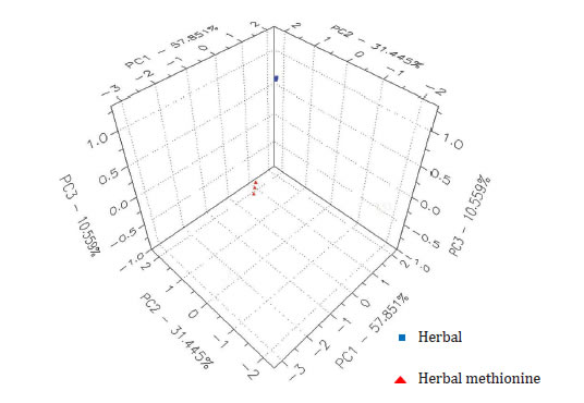 Figure 1. PCA model built with the electronic nose data related to the herbal methionine and herbal choline.