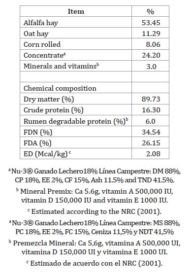 The experiment was conducted at the experimental station of the UASLP (22°11' N, 100°56' O, 1850 m above sea level) with a mean temperature of 17.5°C. Twenty multiparous dairy Holstein cows (body condition score, BCS = 3.1 ± 0.15; mean ± SE), were fed a basal diet (16.3% CP, 6 RDP and 2.08 Mcal/kg ME) of oat hay, alfalfa hay, rolled corn and concentrate (65% forage, 35% concentrate).