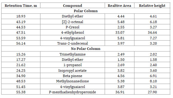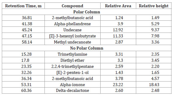 Tabla 2. Identificación tentativa de los compuestos volátiles de metionina herbal derivados del cromatógrafo de nariz electrónica.