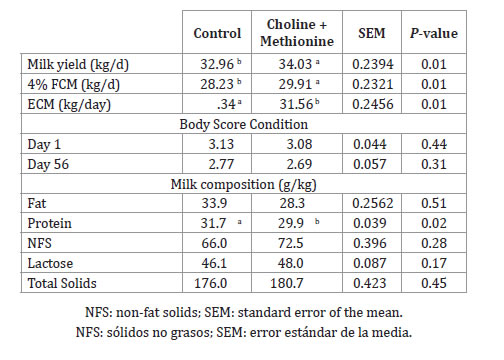 Tabla 4. Efecto de la suplementación con colina y metionina herbales en la producción y composición de leche de vacas Holstein.
