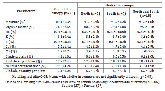 Table 2. Means and standard deviations of bromatological values and yield of cladodes per plant of O. ellisiana planted outside and under Prosopis canopy in Mendoza Province, Argentine.