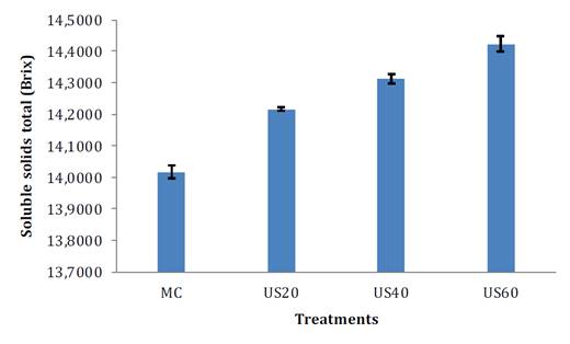 Figure 2 shows SST (°Brix) of the treated and untreated samples. SST increased significantly (p <0.05) after TS and temperature, as observed for mango pulp, apple juice and cherimoya pulp, (1, 5, 25). During ultrasound treatments, polysaccharide diffusion coefficient and solubility increased, mainly due to cavitation in the plant matrix, fracturing cell walls (32). An alternative explanation states that increasing SST (°Brix) is given by micro evaporation of water during ultrasonic cavitation (17, 25). According to Makino et al. (1983), cavitation causes a dissociation of water molecules into hydrogen ions (H+) and hydroxyl groups (OH-) increasing pulp ° Brix. Figure 3 shows vitamin C values of the treated and untreated samples.