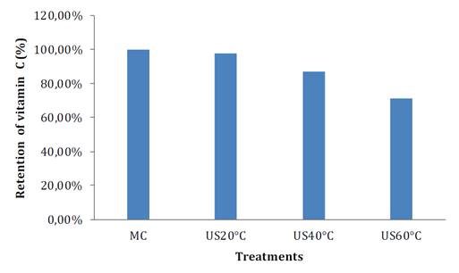 Significant differences (p <0.05) in vitamin C retention among control sample and treatments were found with temperatures around 40 and 60 °C. The lowest vitamin C retention value (71.05%) occurred for TS around 60 °C, followed by TS at 40 °C with 86.84%. On the contrary, no significant differences could be found for TS at 20 °C. Our results agree with those reported by Dabir and Ananthanarayan (2018) in custard apple. These authors found no significant effect between treated and untreated samples with US at room temperatures. However, Abid et al. (2014) indicated that under TS, when temperature raised above 40 °C, a significant loss of vitamin C occurred. The synergistic effect of radical formation (OH-and H+) and temperature during thermosonication, triggers hydrolysis, decarboxylation, regrouping and cyclization reactions, initiating the formation of compounds like 2,3-diketogulonic, 3-hydroxy acids -2-pirone, and 2-furoic, losing nutritional value (23).