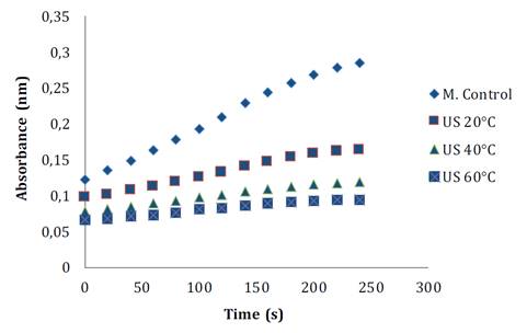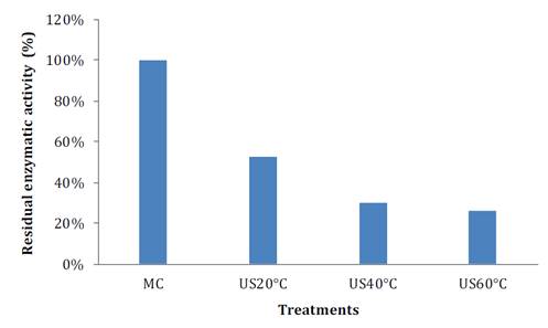 According to Ercan and Soysal (2011) ultrasonic generated heat, and exposure time leading to increased sample temperatures, allow the reduction of POD and PPO activities. When US is combined with temperature, a synergic effect generates enzymatic dissociation of the prosthetic group, significantly decreasing (p<0.05) the content of the structure of the helix/alpha and causing conformational changes in the secondary and tertiary structures of POD and PPO after cavitation effect. This finally leads to partial or total protein denaturation (14, 20, 22).