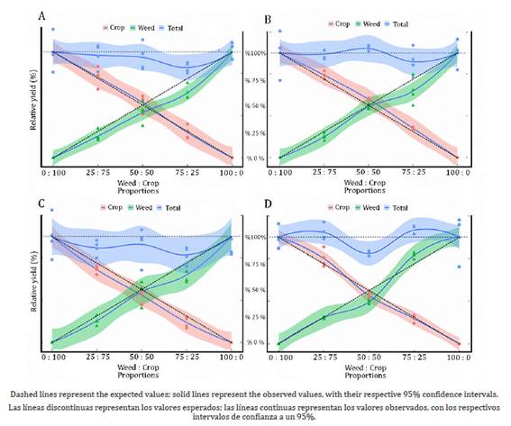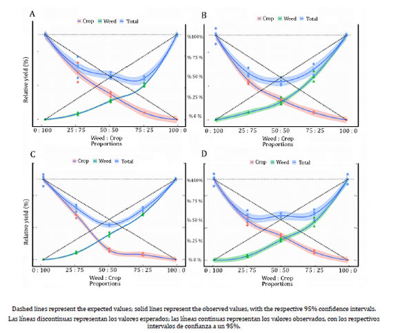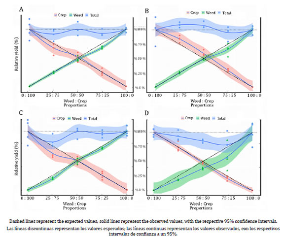 Weeds, if not properly controlled, reduce both grain yield and quality, in addition to hosting insects and diseases and hampering mechanized harvest (17). Experiments with replacement series are used to assess weed interference on crops by helping to understand how distinct plant species perform when grown in a community (26). The development of strategies to minimize the effects of weeds on crops is essential in the agriculture since there is an environmental need to reduce pesticide applications while maintaining high grain yields to guarantee the economic sustainability of farming.