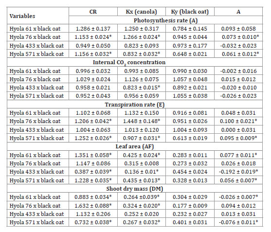 This was reported for Hyola 76 and 571 for all variables except Ci, and for the leaf area of Hyola 433 (Table 3). This endorses Hyola 76 and 571 as more competitive with black oat than Hyola 61 and 433. The joint study of the values of CR, K (dominance), and C (competitiveness) represents the reliability between the studied competitiveness (6).