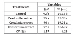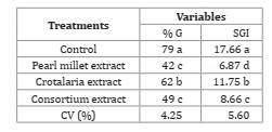 Table 3: Percentage of germination (% G) and speed of germination index (SGI) of hairy beggarticks in the presence of cover plants aqueous extracts (pearl millet and crotalaria).