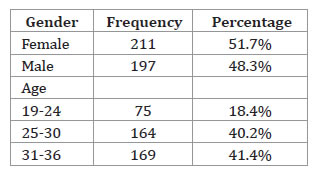 From the total, 51.7% corresponded to females, whereas 48.3% corresponded to males, a similar result to that reported by National Institute of Statistics - INE (30) about the sociodemographic distribution of the Metropolitan Region. Most respondents were between 31 and 36 years old, corresponding to 41.4% followed by those between 25 and 30 years old with 40.2% and then those between 18 and 24 years old with 18.4% (table 1).