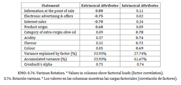 These attributes related to electronic commerce have been considered an important factor by olive growing companies, since the image of the product on the internet is considered essential to boost sales (38). This factor, with 29.9% of variance, was explained by 4 observed variables, with a Conbrach's Alpha of 0.73. The other factor, called "Intrinsic Attributes" included "olive oil category", "acidity", "flavour", and "colour". This factor, representing 27.7% of the variance was explained by 4 observed variables and had a Conbrach's Alpha of 0,74, considered acceptable by literature (2, 23, 43).