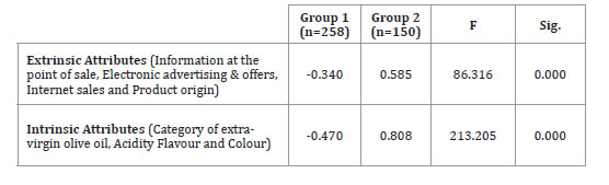 Group 1: "Non- Traditional or Millennials Consumers" (n=258). This result is the biggest of both groups, mainly formed by people between 30 and 35 years old. This segment was characterized by having a negative attitude towards the olive oil origin.