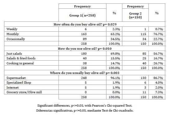Group 2 evaluated intrinsic attributes at the moment of purchasing, especially those of flavour and colour, which is similar to that reported by Del Giudice et al. (2012). These attributes had been used in the past (16), possibly influenced by the previous generation. This group also considered product origin and information provided at the point of sale. Besides, consumers from Group 1 did not appreciate attributes like origin and information at the point of sale, which could be associated to inadequate knowledge or appreciation of the product. In relation to similarities, both groups considered olive oil to be expensive. In this context, the research made by Dekhili and d'Hauteville (2009) reported that price is the most critical free -choice attribute when choosing olive oil in Tunisianand France (10). Moreover, Delgado and Guinard (2011) determined that price, available information, and the prestige of AOEV (Extra-Virgin Origin Appeal) were crucial factors encouraging purchases of the American survey respondents (12).