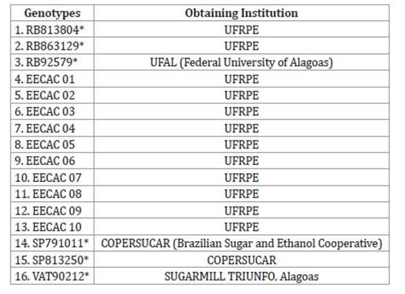 Sixteen genotypes were evaluated: ten promising clones from the sugarcane genetic breeding Program of the Federal Rural University of Pernambuco, affiliated to the Interuniversity Network for the Development of the Sugar and Energy Sector (PMGCA/UFRPE/ RIDESA), and six standard commercial varieties (Table 1).