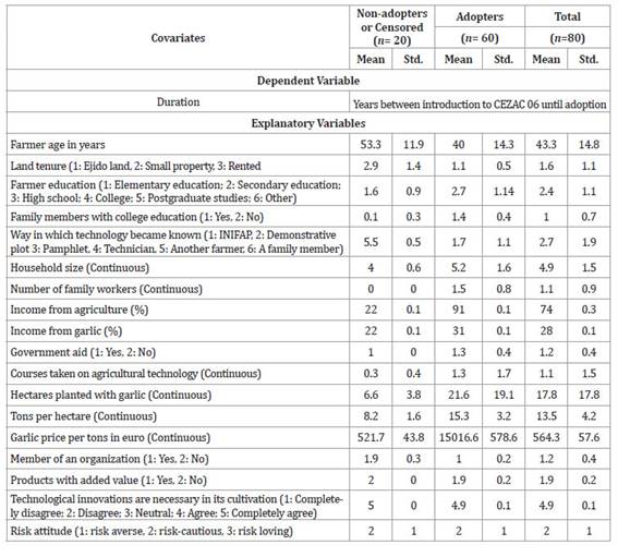 No studies on garlic cultivation address adoption of new varieties nor the time it takes farmers to adopt a technological innovation. In this context, we evaluated adoption behavior for the improved garlic (Allium sativum L.) variety known as CEZAC 06 and other factors associated with the adoption process in Northern-Central Mexico through survival analysis (SA). We evaluated the hypothesis that whether farmers adopt depends on the type of technology under consideration. Thus, a greater perceived utility results in a shorter adoption time.
