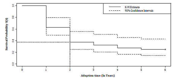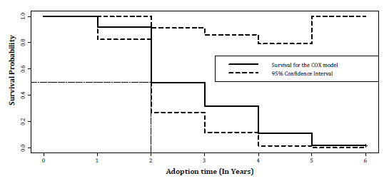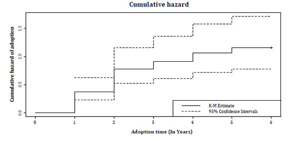 The previous statement is confirmed by the cumulative hazard function (Figure 3), where in the third year, the cumulative hazard of adoption is 0.80.