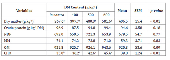 observed post the in natura, 500 g kg-1 DM, and 600 g kg-1