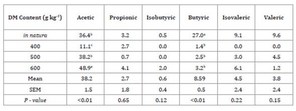 0.01). Tanzania grass with 500 and 600 g kg-1 DM produced the highest