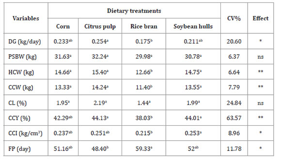 For daily gain means, the citrus pulp diet (0.254 kg/day) and the rice diet (0.175 kg/day) differed from each other (p<0.05) but were statistically similar to corn and soybean hulls. The lowest daily gains for the rice bran treatment can be explained by the reduction in the digestibility of nutrients, especially proteins (12, 30, 33). Tabeidian and Sadeghi (2008), studying different levels of rice bran in lamb diets observed a linear reduction in daily gain with increasing levels of rice bran in the diets.