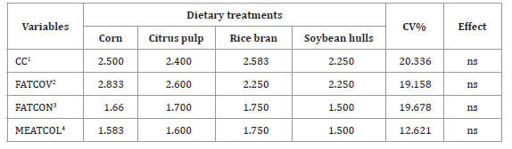 The estimated means and coefficients of variation for carcass composition, fat cover, fat consistency, and meat color of crossbreed Highlander lambs fed with different energy sources are presented in Table 3, however the supplementation with different energy foods did not influence these variables.
