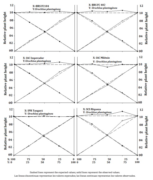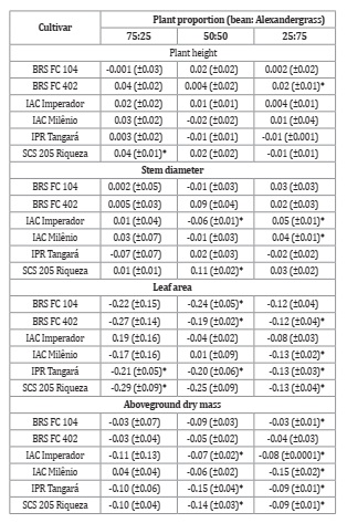 With regard to PRT, there were no statistical differences between the expected and estimated values only for the plant height, where it presented average values close to 1 in all combinations (Figure 1, Table 1), demonstrating that the bean and Alexandergrass compete for the same environmental resources.