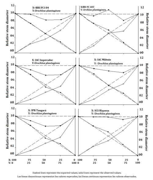 The stem diameter of BRS FC 104, BRS FC 402, IAC Imperador, IAC Milênio, IPR Tangará, and SCS 205 Riqueza showed deviations from the PR lines in relation to the expected lines, indicating that the crop was more damaged than the weed (Figure 2).