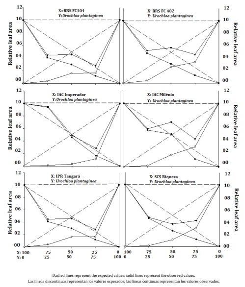 The PRT values (Figure 3) were all lower than 1 with concave lines, indicating that both the crop and the weed were harmed. When studying the effect of weeds on soybean (9) and black beans (12), these studies reported that there were concave lines for the crop and competitor for the leaf area and dry mass, which corroborates our findings. These same authors, assessing the competitive ability of transgenic soybean cultivars with weeds, also reported similar findings for both the leaf area and dry mass. The leaf area showed decreases of up to 48.67% when the crop competed in the proportion of 50:50 with the weed (Table 2), demonstrating that the crop and weed compete for the same environmental resources. Forte et al. (2017) also found similar results.