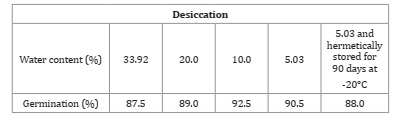 Table 1: Mean water content (%) and germination of Phoenix roebelenii seeds subjected to desiccation and storage.