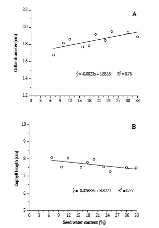Figure 3: Collar diameter (A) and eophyll length (B) of Phoneix roebelenii seedlings as a function of seed water content.