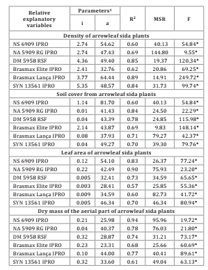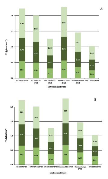 sida. The lowest values of TL varied from 0.26 to 0.61 plants m-2 for cultivars DM 5958, Brasmax