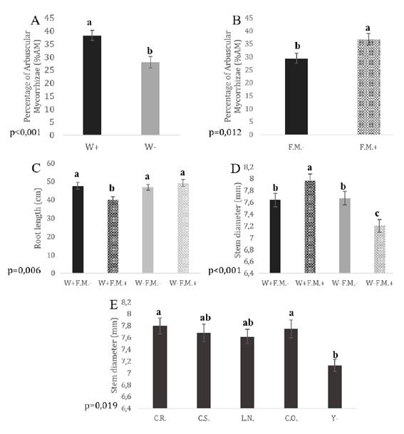 arbuscular Funneliformis mosseae (con/sin), e inoculación con cuatro