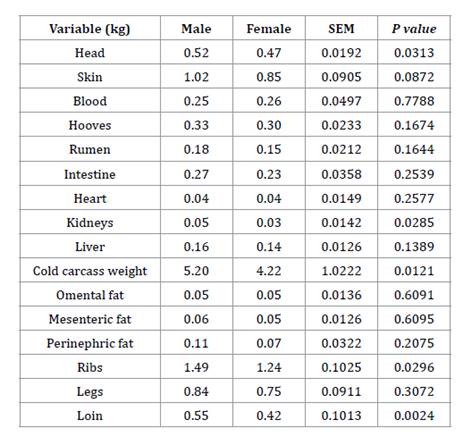 and showed no differences (P≥0.05) concerning sex. Carcass, kidneys, head, neck,