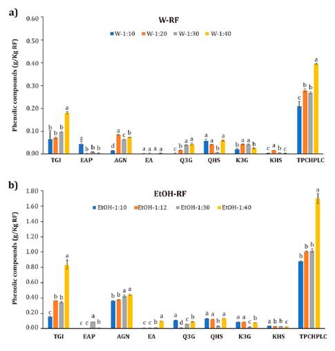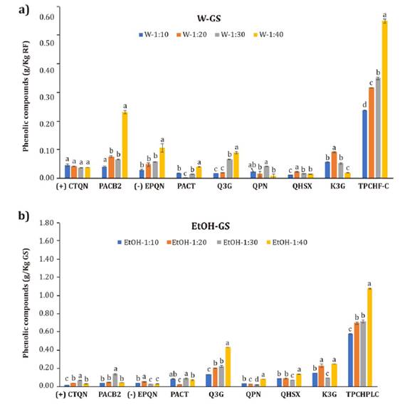 and the profile of phenolic compounds of the GS and RF extracts. The solvent