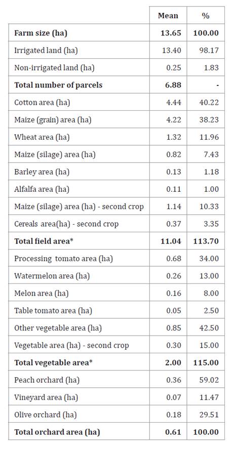Average farm size was 13.65 ha, irrigated land size was 13.40 ha, non-irrigated land size was 0.25 ha, and 6.88 average number of plots. Almost 40.22% of field area, 11.04 hectares, is dedicated to cotton cultivation, while 38.23% is used for grain maize, 11.96% for wheat, 10.33% for silage maize (second crop), 7.43% for silage maize, 1.18% for barley, 1.00% for alfalfa, and 3.35% for other cereals (second crop). Regarding orchards, 59.02% of 0.61 hectare is dedicated to peach production, 29.51% to olives, and the rest are vineyard (table 2).