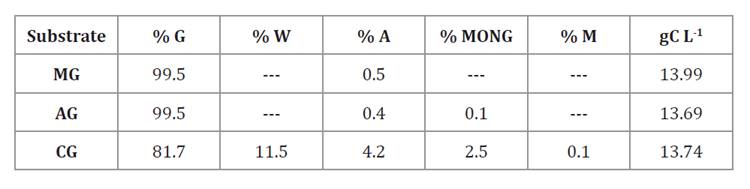 % G: % glucosa o glicerol; % W: % agua; % A: % cenizas; % MONG: % materia orgánica no glicerol; % M: % metanol; gC L-1: g de carbono útil por L de medio de cultivo.