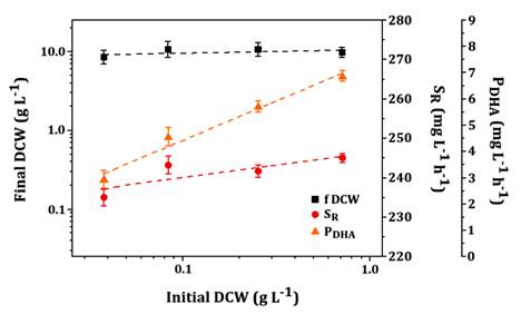 To understand the influence of the initial inoculum size added to the media on main culture parameters, tests were developed in 250 mL batch shake flasks with 100 mL PMG* medium at 150 rpm and 28 ± 2°C for 120 h. Figure 1, shows the initial inoculum concentration of Aurantiochytrium sp. in relation to final cell concentration (fDCW), SR, and PDHA.