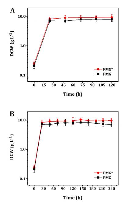The development of Aurantiochytrium sp. cultures in 250 mL batch shake flasks at two final culture times was analyzed using PMG* and PMG media. Figure 2, shows cell concentration curves at 120 h (figure 2A) were slightly higher for PMG* than for PMG medium, but showed similar behavior. An increase in culture time until 240 h (figure 2B) displayed the same behavior as for 120 h, with no major difference in DCW, and remaining constant during the stationary phase.