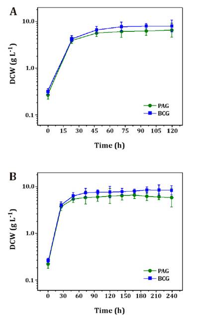 The μ parameters are practically similar for all tests, with values close to those reported with PMG medium, demonstrating that glycerol was an adequate substrate for Aurantiochytrium sp. Concerning DCW, BCG showed the best performance at both culture times, and lower values were observed at 240 h culture, with a decrease of 10 and 24% for PAG and BCG, respectively.