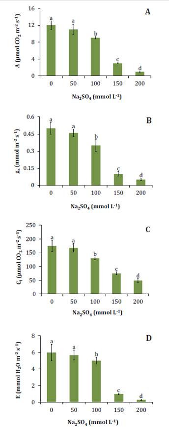 Salinity inhibited photosynthesis and stomatal conductance at 100 mmol L-1 Na2SO4 (figure 3A, B), causing internal CO2 concentration (figure 3C) and transpiration (figure 3D) to decrease.