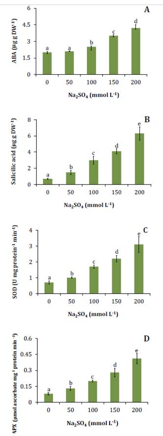 Figure 4. Abscisic acid (A), salicylic acid (B), superoxide dismutase activity (C), and ascorbate peroxidase activity (D) in N. ruscifolia seedlings grown in increasing concentrations of Na2SO4.