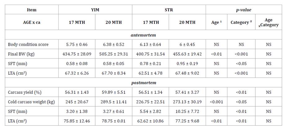 ¹ effect of slaughter age, 17 or 20 months. / ² effect of animal category, YIM or STR NS: Non-Significant. / NS: No Significativo.