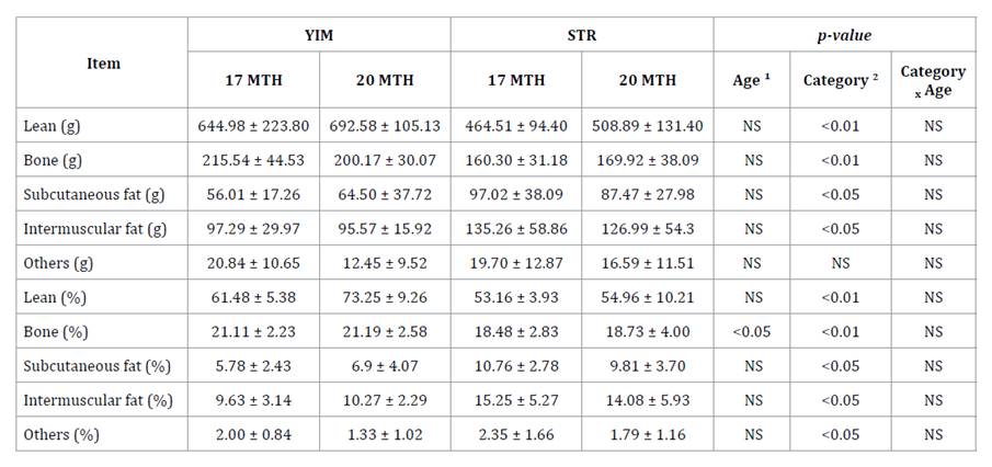 Table 2. Tissue composition of the 10th rib (mean ± SD) of young intact males (YIM) and steers (STR) at two slaughter ages, 17 and 20 months, in a pastoral system with supplementation.