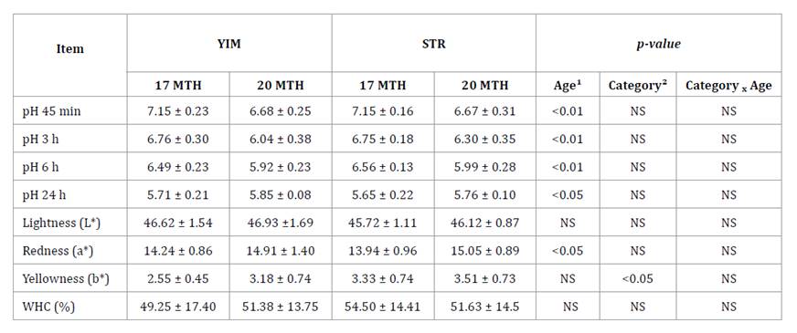 Table 3 shows the physicochemical parameters (pH, color, WHC) corresponding to LT muscle in both categories and slaughter age.