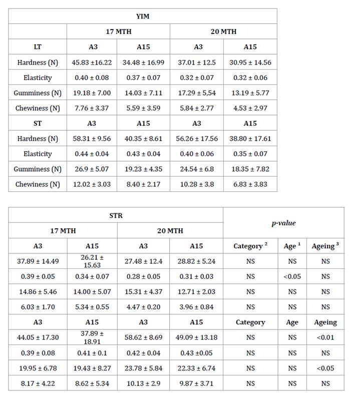 The hardness and elasticity of ST muscle showed an interaction between slaughter age and category. Significant differences (p <0.05) were found in the elasticity of LT muscle between the two ages of slaughter, but not between animal categories (YIM and STR). Meat elasticity decreased with increasing animal age. Significant differences (p <0.05) were also found in hardness and gumminess of ST muscle between ageing time of 3 and 15 days, concluding that as ageing progressed, meat became less hard and gummy.