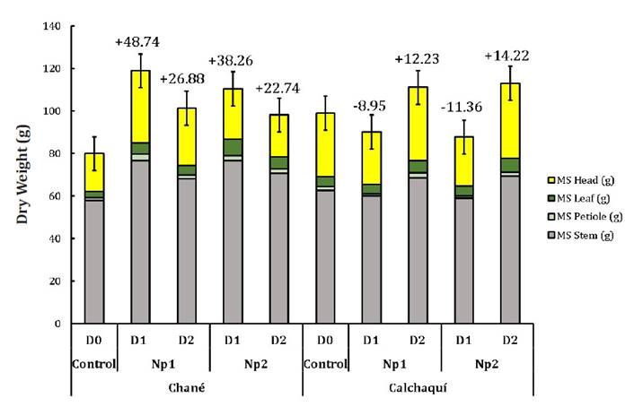 dry weight accumulation and achene yield. Chané’s parameters improved at both