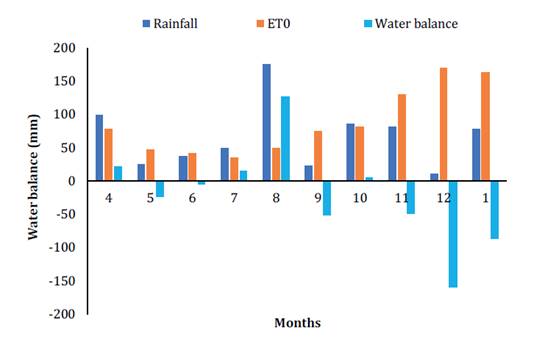 Rainfall was comparatively low during June, September, and December. However, there was a soil profile recharge in August. The water balance analyzed the relationship between rainfall and potential evapotranspiration (figure 1).