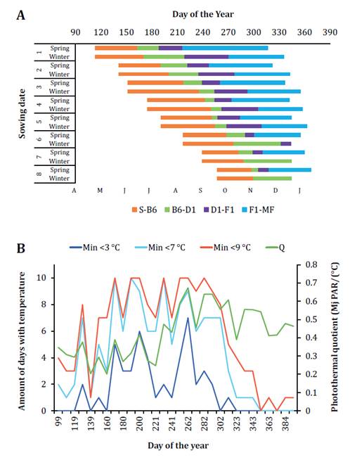 From the fifth sowing date onward, the growth cycle of the winter cultivar changed from shortening to extending because the vernalization requirements were not satisfied. Vernalization-requiring cultivars increase their development rate as temperature accumulates from 4°C to 9°C. From the 250th day of the year (coinciding with the emergence of the winter cultivar sown on the sixth sowing date), a noticeable decrease in the number of days with minimum temperatures below 7 and 9°C was observed (figure 2B). Consequently, the winter variety sown after July did not flower by the time of harvest of the other treatments.