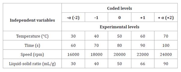 optimized at 50°C, with 76 seconds, extraction speed of 19200 rpm, and
