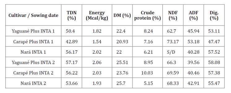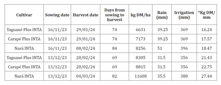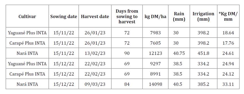 three cultivars tested. Nará INTA was the most productive cultivar on both