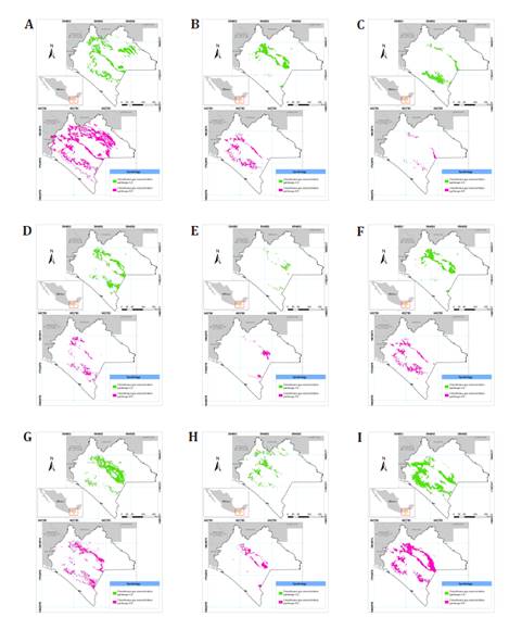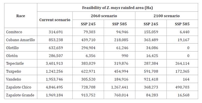 Feasibility of the nine rainfed maize races in Chiapas under climate change scenarios (2041-2060 and 2081-2100) was modeled using the same presence records and environmental variables as the current scenario. Similarly, the same parameters were used in MaxEnt.