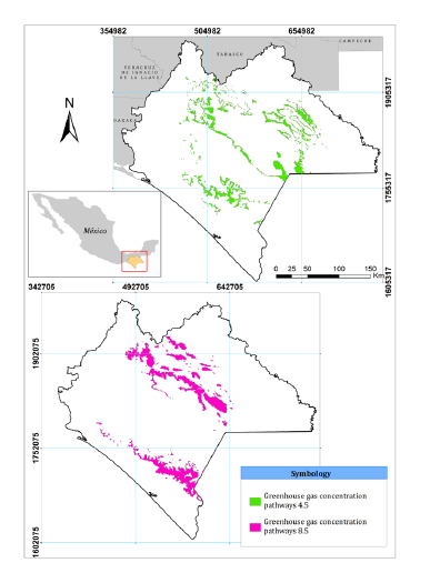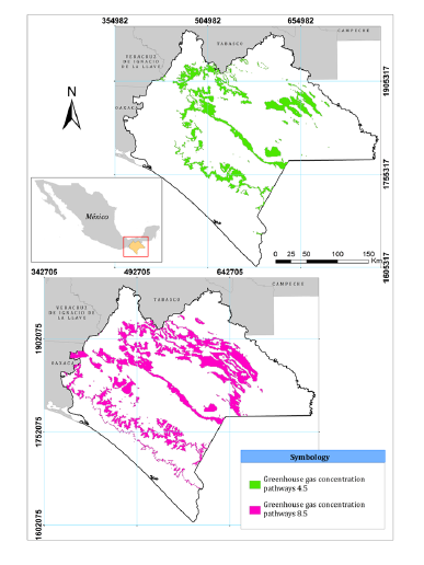 Figure 3. Feasibility of rainfed areas for the Zapalote Chico maize race (Z. mays) by 2060 under two greenhouse gas concentration pathway scenarios (4.5 and 8.5), in Chiapas, Mexico.
